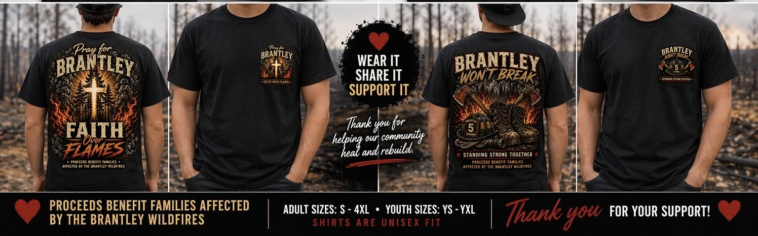 Shop › Brantley Wildfire Support Image 1 of 2 Image 2 of 2 Brantley Wildfire Support $30.00 Size: Select Size Sm Md Lg Xl Xxl Color: Select Color White Black Grey Add To Cart Added!